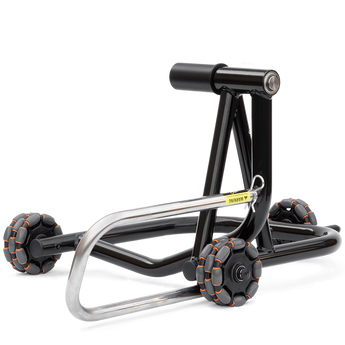 片側リア スタンドには、ハブの中央に大きな穴がある片側スイングアームを備えたバイクが必要です。スタンドには、バイクのモデルに合わせたスピンドルが取り付けられています。バイクを変更する場合は、BMW、Ducati、MV Agusta、Honda、KTM、Triumph などの他のブランド用の (交換可能な) スピンドルがあります。