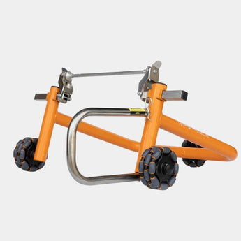 片側リア スタンドには、ハブの中央に大きな穴がある片側スイングアームを備えたバイクが必要です。スタンドには、バイクのモデルに合わせたスピンドルが取り付けられています。バイクを変更する場合は、BMW、Ducati、MV Agusta、Honda、KTM、Triumph などの他のブランド用の (交換可能な) スピンドルがあります。