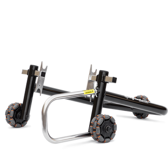 片側リア スタンドには、ハブの中央に大きな穴がある片側スイングアームを備えたバイクが必要です。スタンドには、バイクのモデルに合わせたスピンドルが取り付けられています。バイクを変更する場合は、BMW、Ducati、MV Agusta、Honda、KTM、Triumph などの他のブランド用の (交換可能な) スピンドルがあります。
